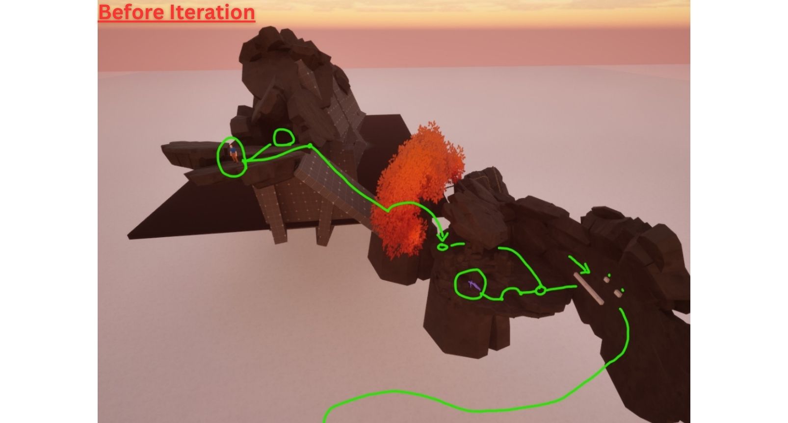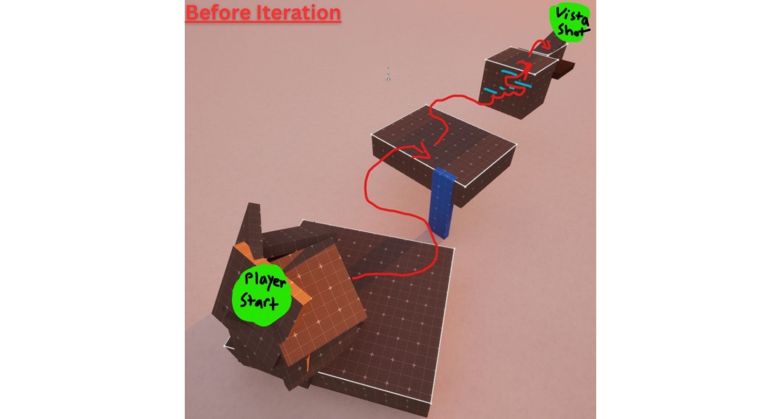 I found it extremely important to do design markups and dev-logs as I developed to track my progress and come up with better design ideas. After completing a section, I would take on a different view of the space and see how it fit into the gameplay pacing of the overall experience.