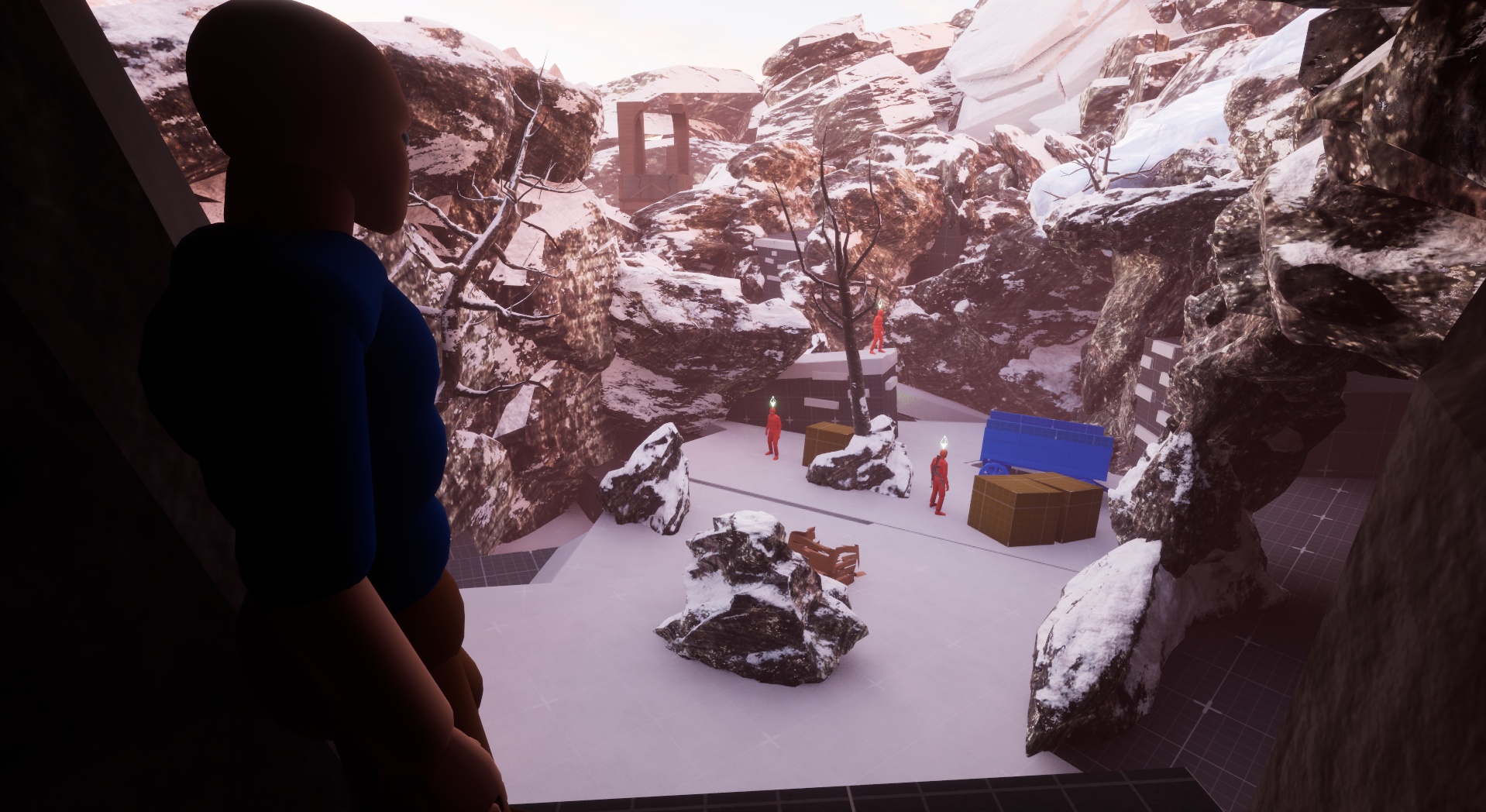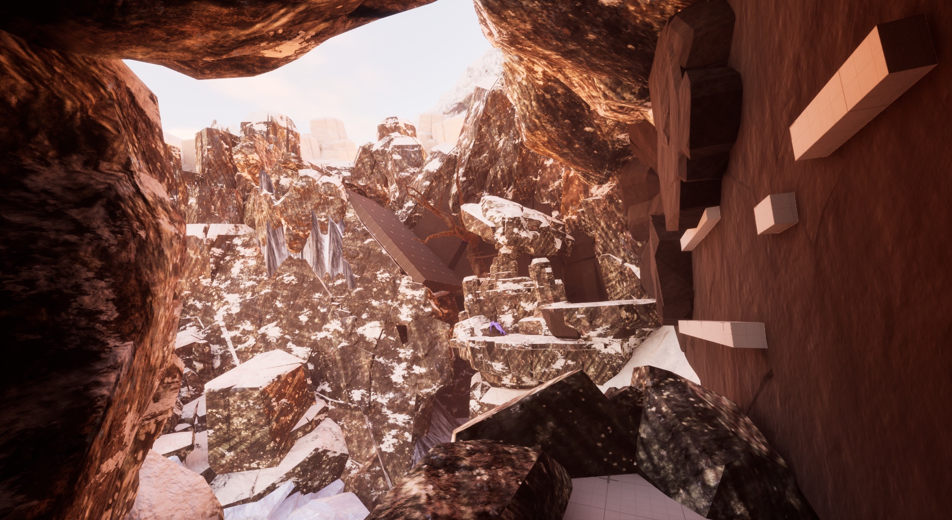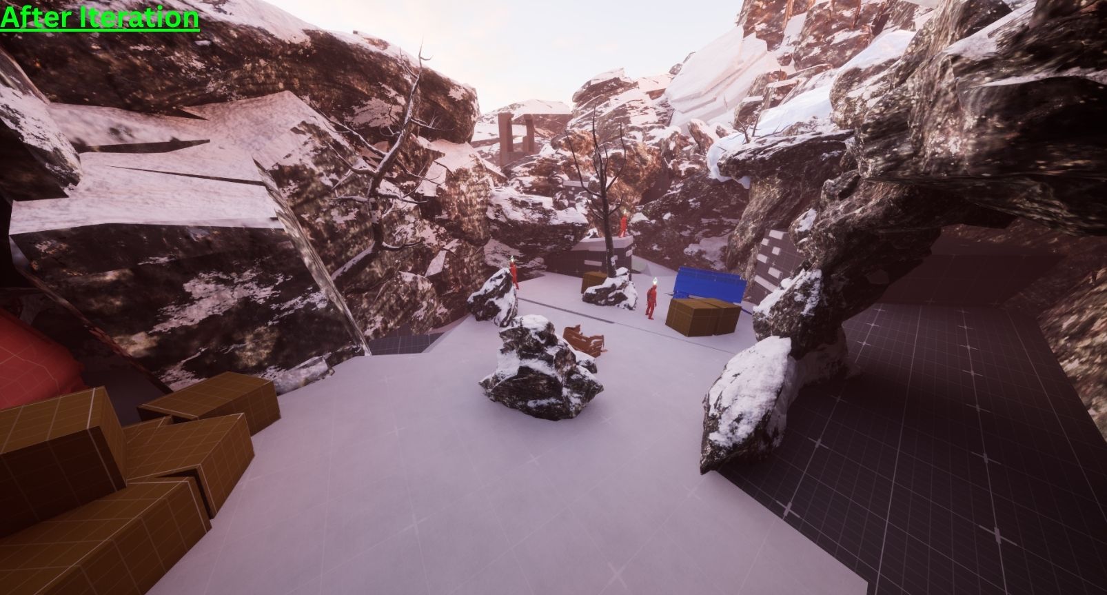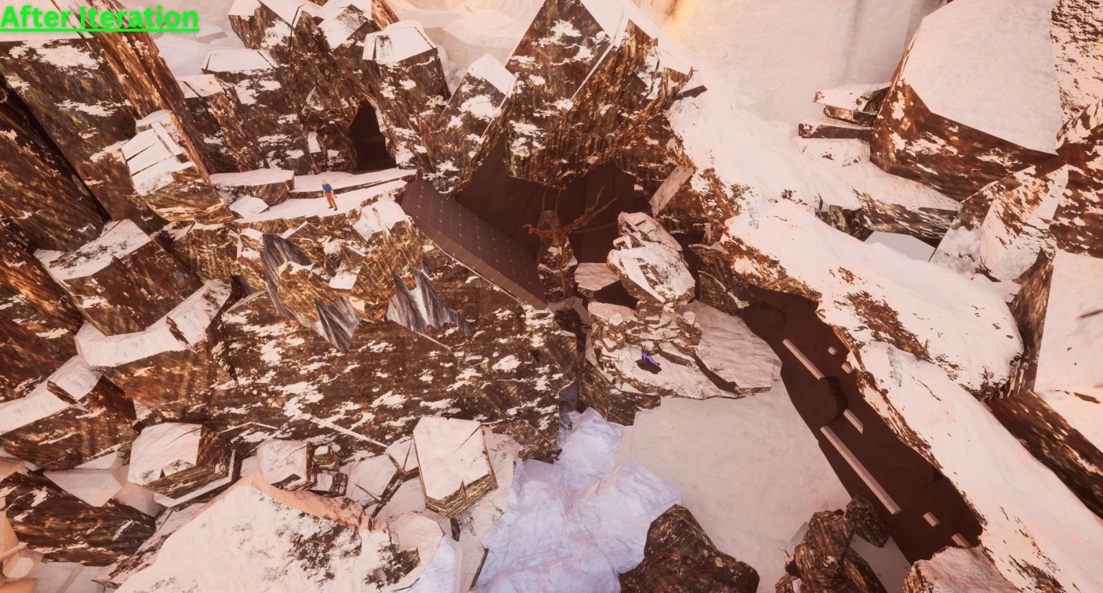 I took a 3-lane approach to this combat space when building it, but I wanted an added layer to that formula. So, I implemented a small ice cave underneath the snow floor that provides a nice flank route to those who find it. It also provides access to a hole in the ground that can be used mid-combat to get the advantage on the enemy. In addition, I also added a tree for the player to utilize as a grapple point to incorporate a familiar mechanic in a new situation.