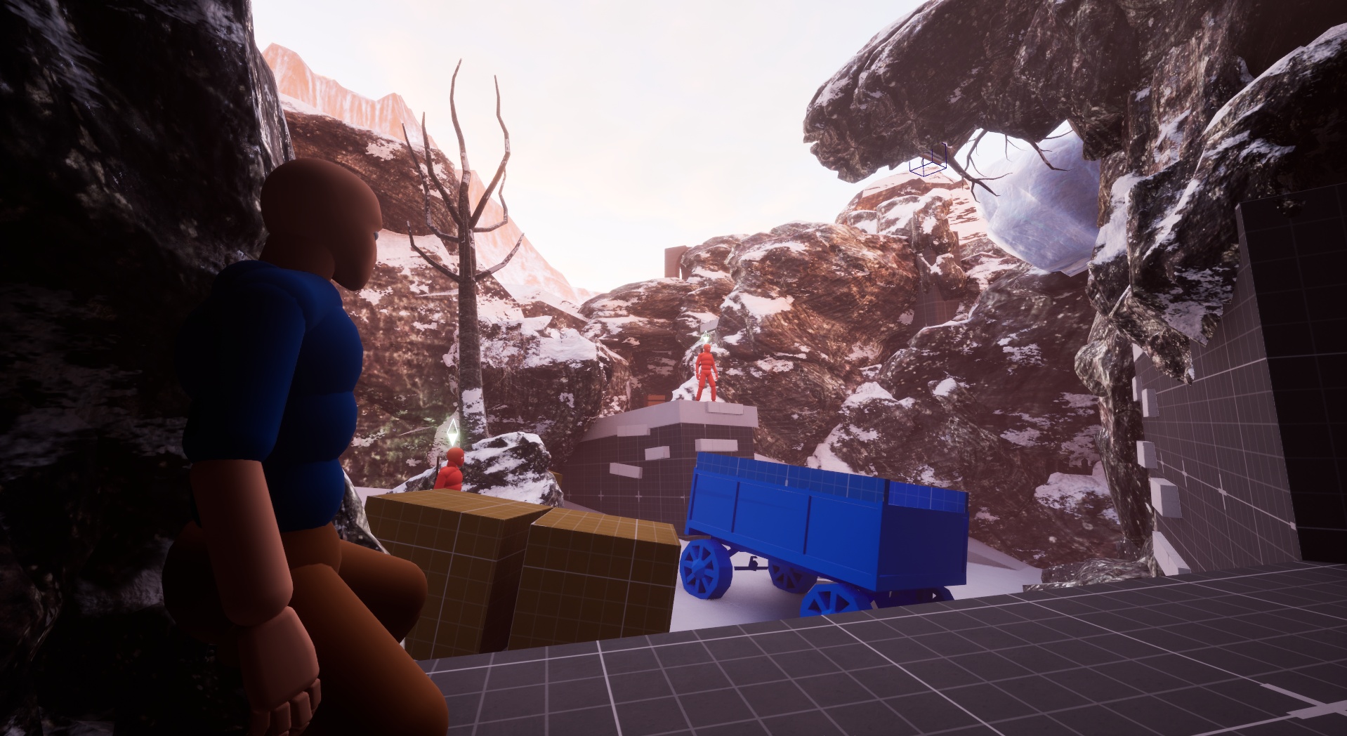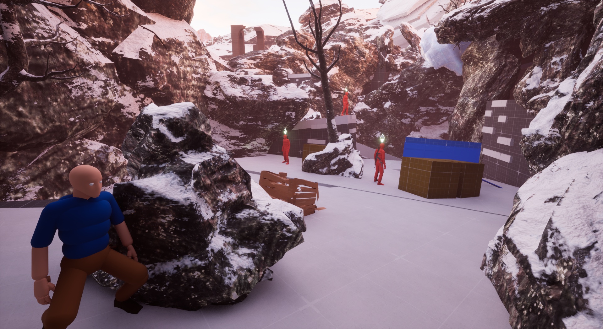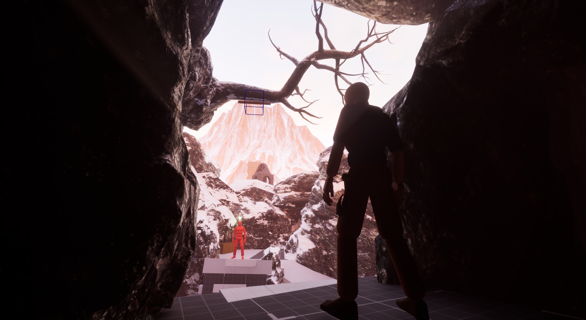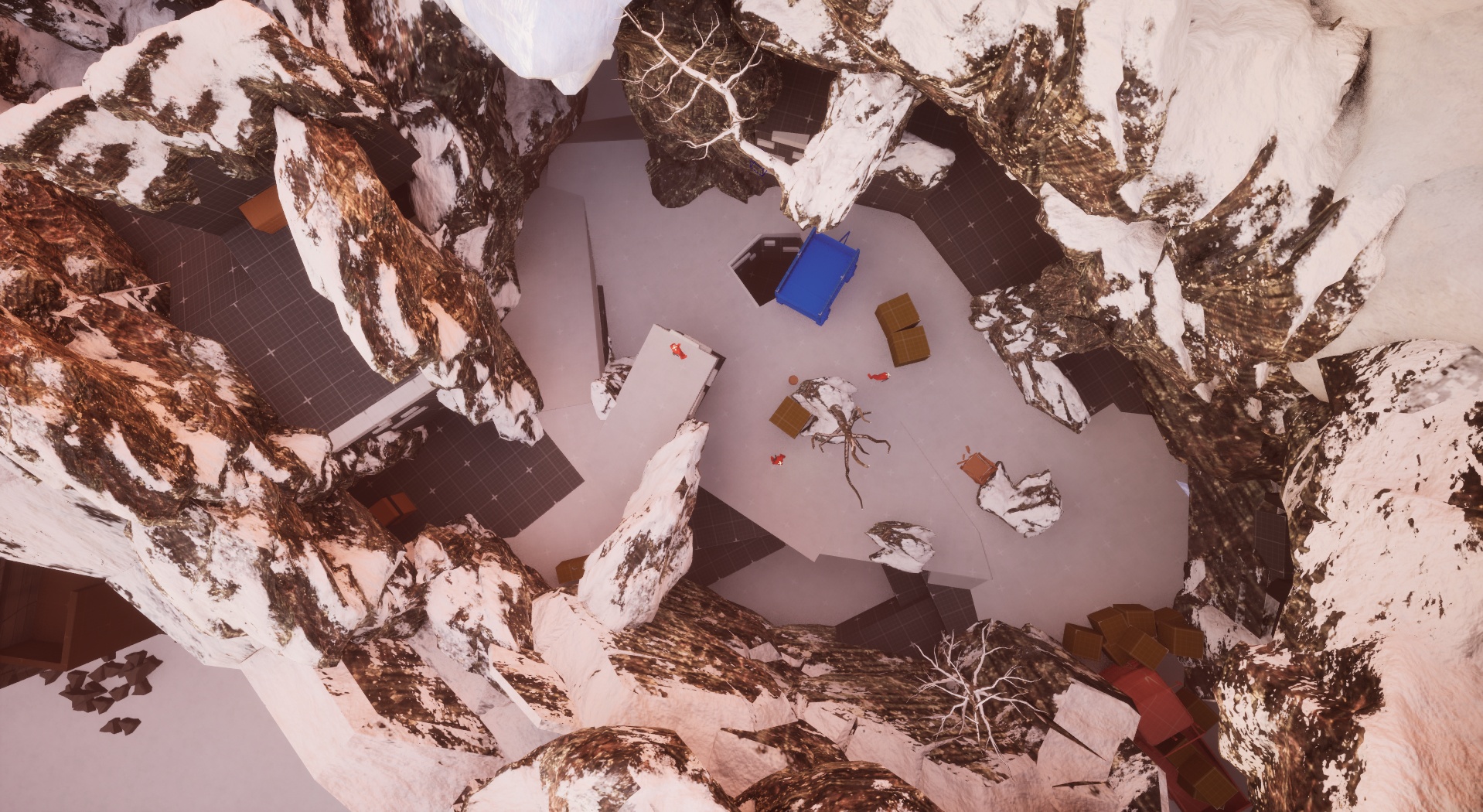 I took a 3-lane approach to this combat space when building it, but I wanted an added layer to that formula. So, I implemented a small ice cave underneath the snow floor that provides a nice flank route to those who find it. It also provides access to a hole in the ground that can be used mid-combat to get the advantage on the enemy. In addition, I also added a tree for the player to utilize as a grapple point to incorporate a familiar mechanic in a new situation.