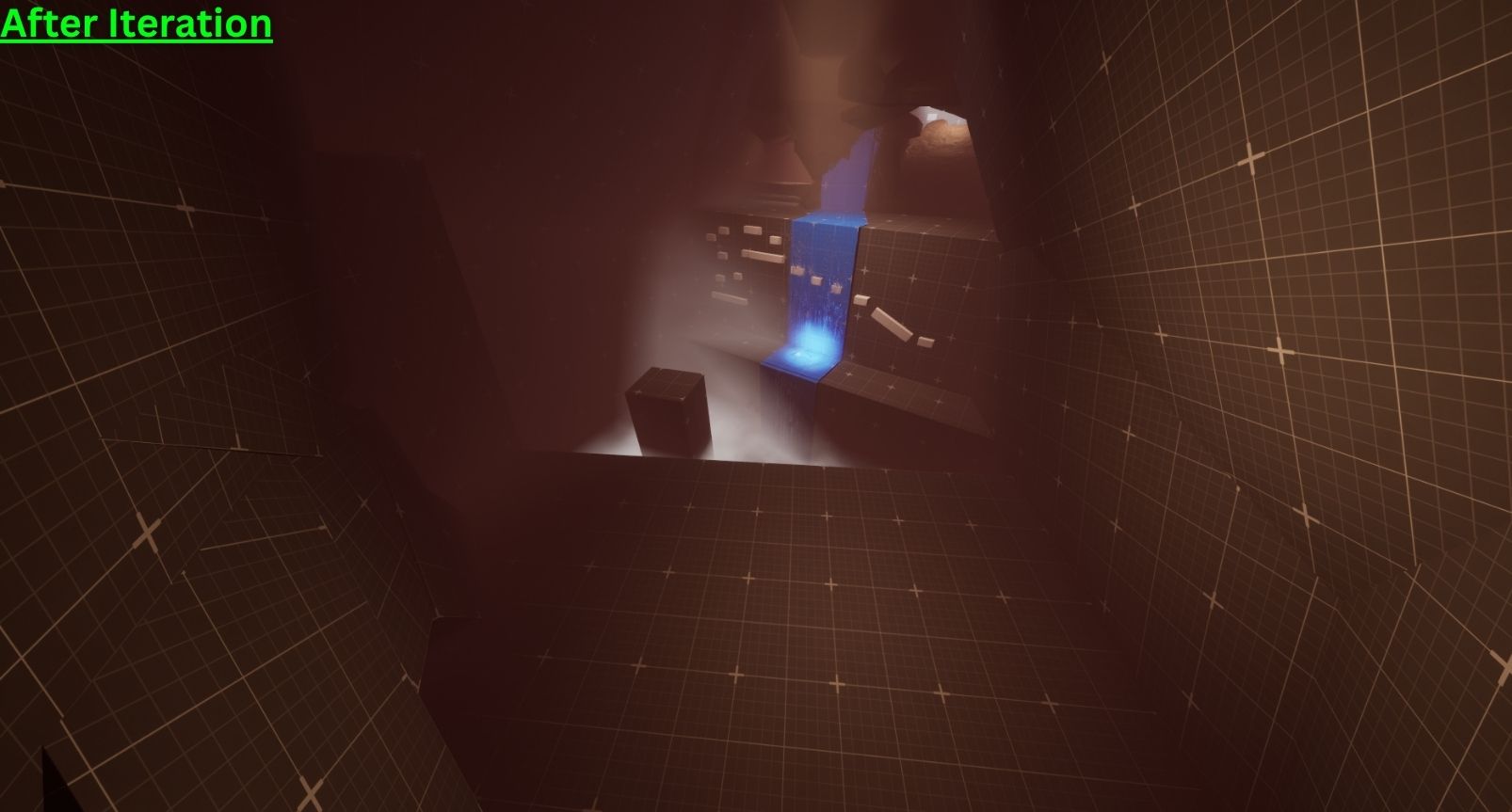 I worked hard to figure out ways in which I could make the level feel fresh at every corner. The key to this was placing different gameplay elements in unique ways and finding cool ways to set them up. For example, I implemented a custom Blueprint in Unreal to create a “Floor Break” event where once the player collides with a certain type of floor, the floor breaks beneath them and causes them to fall.