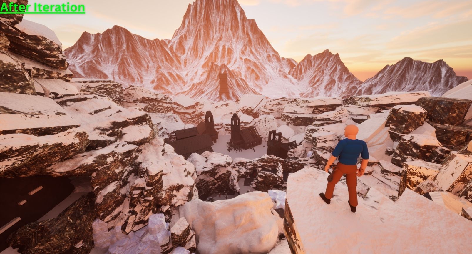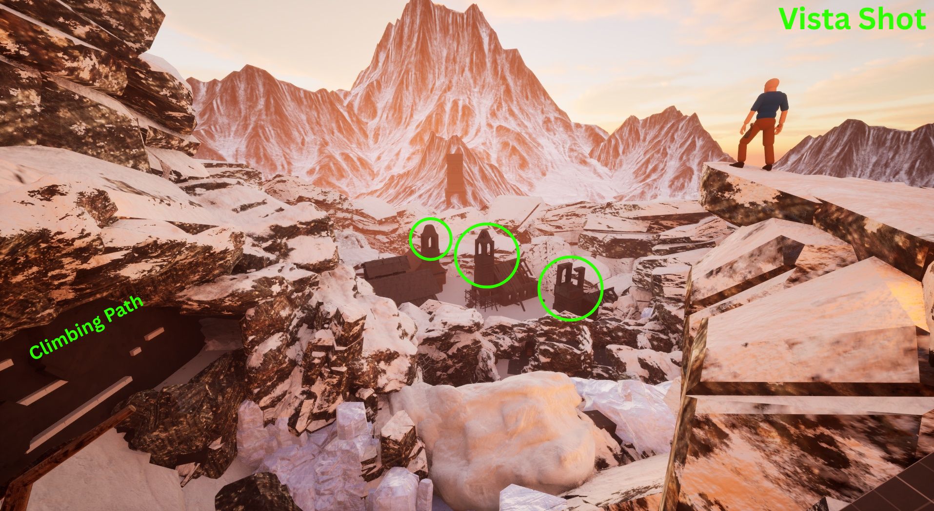 I knew that I wanted to have the main objective be extremely clear to the player simply by the way the camera frames the vista when the player starts. Additional elements like the way the objective mountain is lit would make it even more clear to the player that the top of the mountain is where they are headed.
