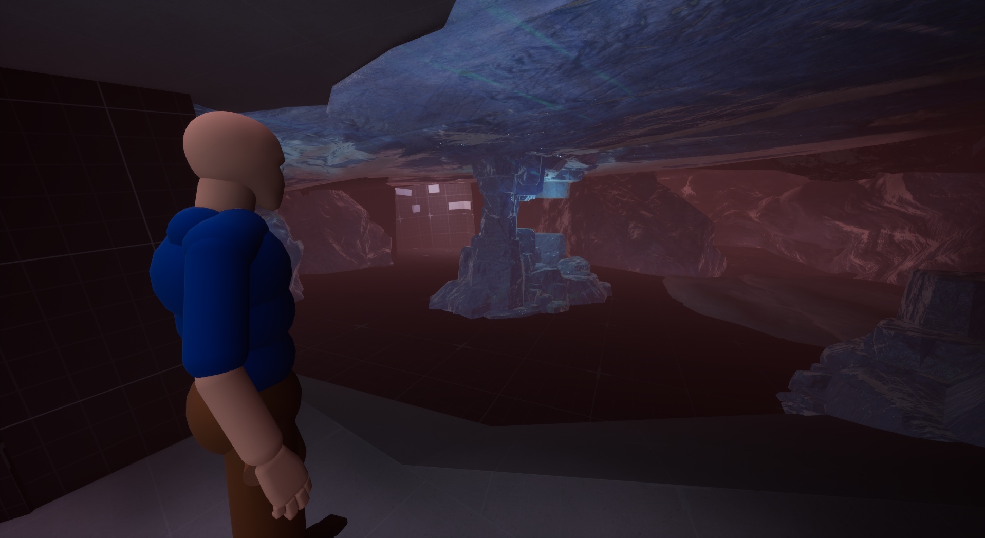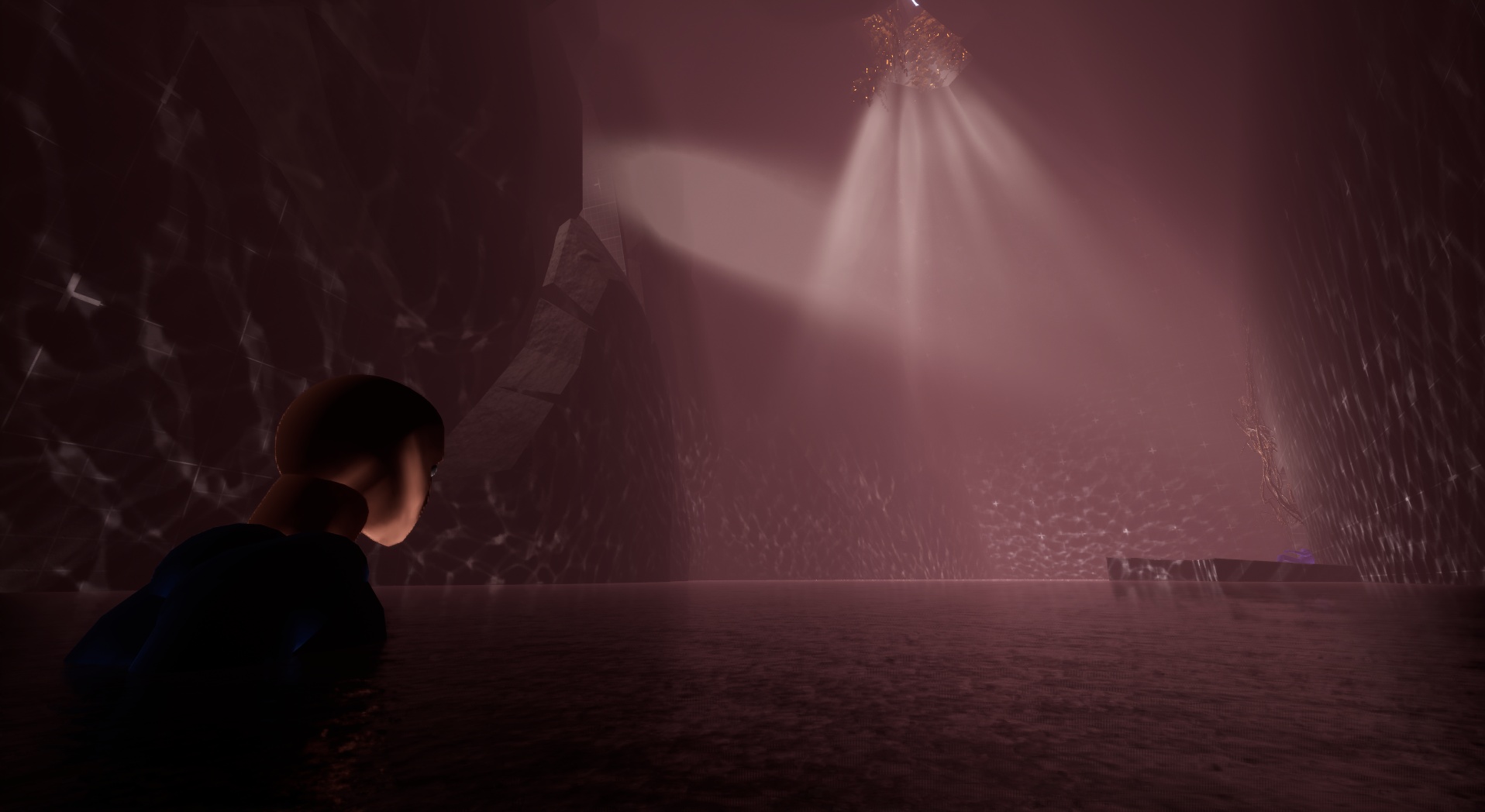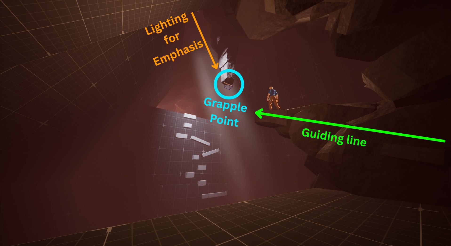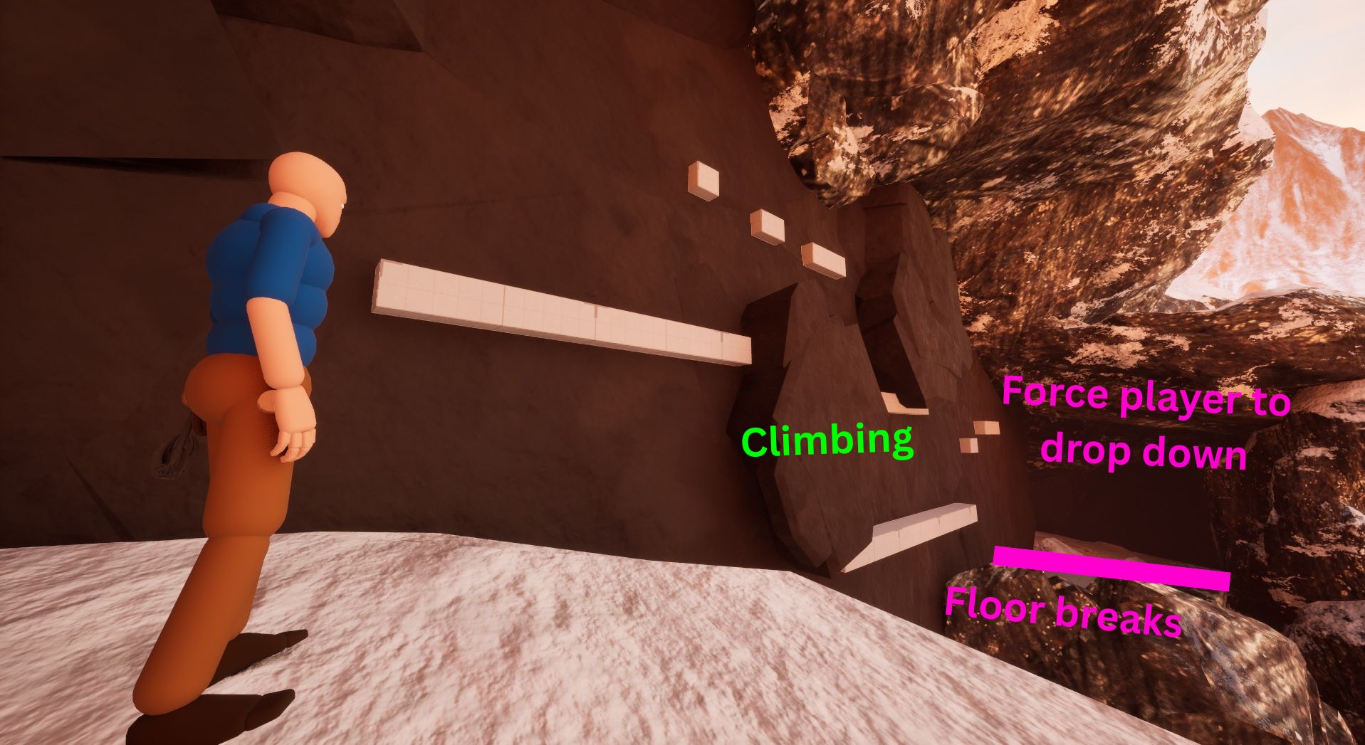 I helped sell this moment by it happen after a tense section of climbing where imminent death is below. I subject the player’s expectations by making them feel safe in dropping to a surface that seems like the right path, while in reality it’s the moment where they fall down into another cave system filled with water.