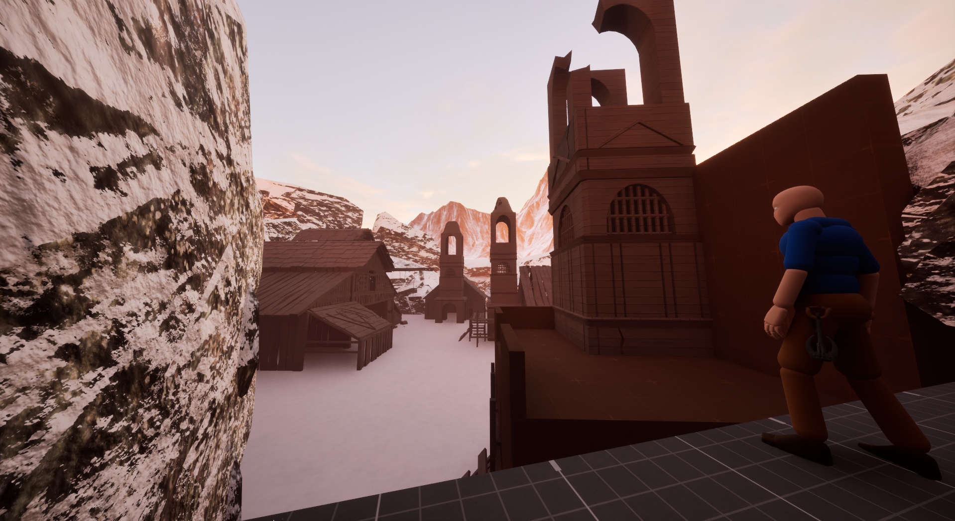 The player finds themselves in the depths of a cave with no recollection of what brought them here. They progress out of the cave to discover that they are in a snowy tundra in the middle of nowhere. An old town is visible in the distance, prompting the player to find a way to it, while confronting any threats along the way.
